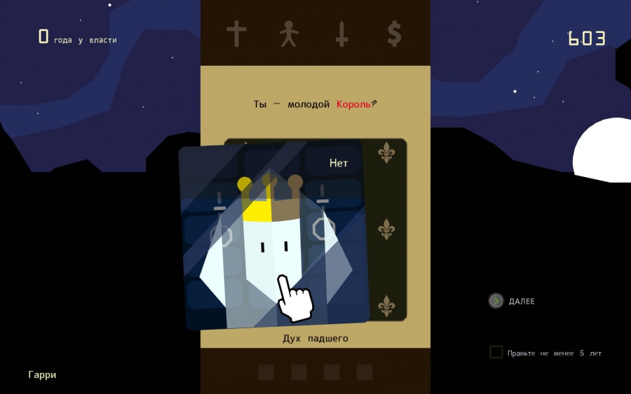 Историю вам придется создавать самим. Все ваше королевство имеет четыре основных составляющих, с которыми придется считать, это сам народ, армия, церковь и деньги. Как вы уже поняли, вам будут выпадать карточки с событиями, а вы решаете, что сделать в данной ситуации. Каждый вариант ответа влияет на одну из сторон королевства. Например, священник пишет вам предложение повысить налоги на церковь, а вам обязуется отдать долю. Не трудно понять, что в данной ситуации ущемляются обычные люди, за то отношения с церковью улучшаются, а казна растет. Иногда вам будет предложен сбор крестового похода на неверных с целью их скорейшего уничтожения. В таком случае ваш народ начнет потихоньку вымирать, нужно заботиться, чтобы в королевстве остались люди.